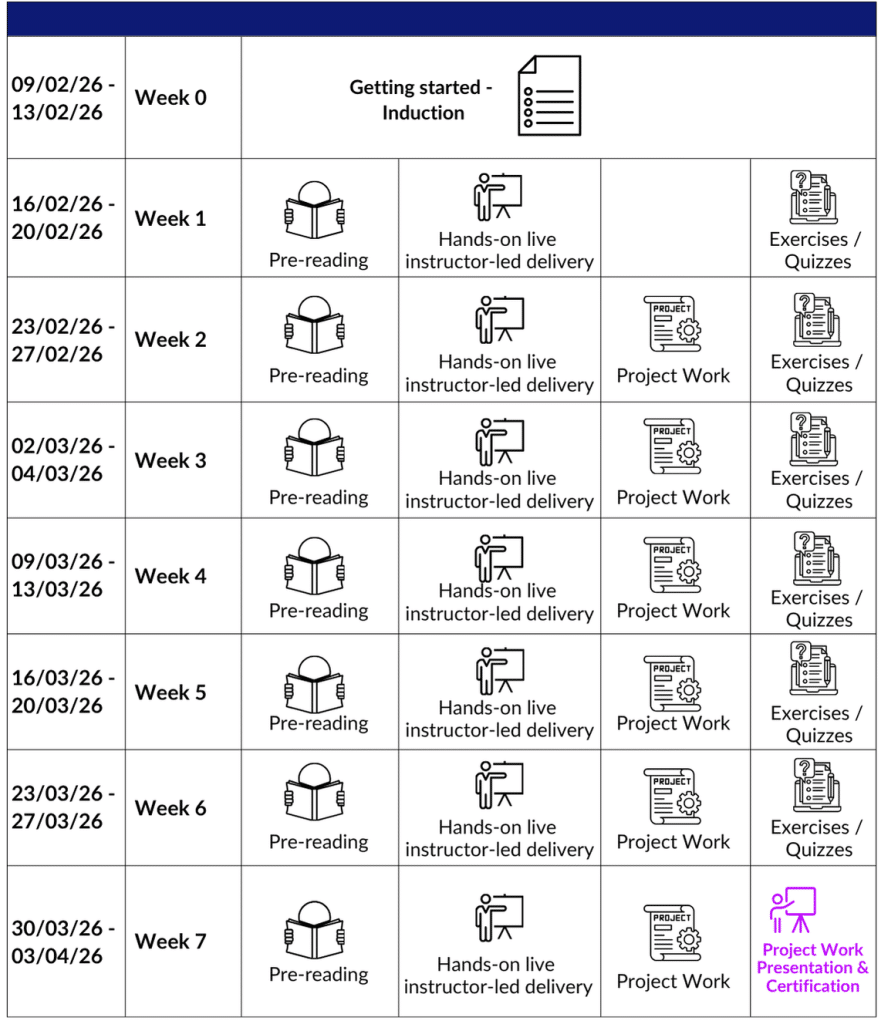 Each bootcamp consists of five full days of hands-on, instructor-led training spread over seven weeks. At the end of the training, participants present an individual project and receive a certificate: